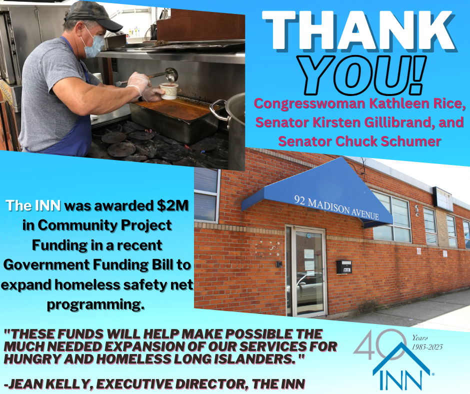 As part of the recent Government Funding Bill, The INN was awarded $2 million in congressionally directed spending for homeless safety net programming. The Bill passed in the Senate and the House just before Christmas. It was sponsored and supported by Congresswoman Kathleen Rice, Senator Kirsten Gillibrand and Senator Chuck Schumer.