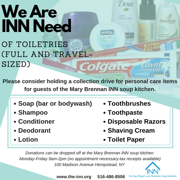 The INN provides essential personal care items to guests to take with them, as well as an option to shower on-site at our facility. To provide this service, we need both full-sized and travel-sized toiletries like, soap, shampoo and deodorant.