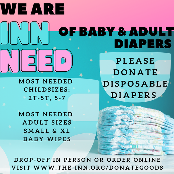 Diapers are an expensive and essential item for families. Little guests make up about 30% of The INN’s guest population. Diapers are needed to distribute weekly, especially in sizes 4 and up. Wipes, pull-ups, baby food and formula are also needed.