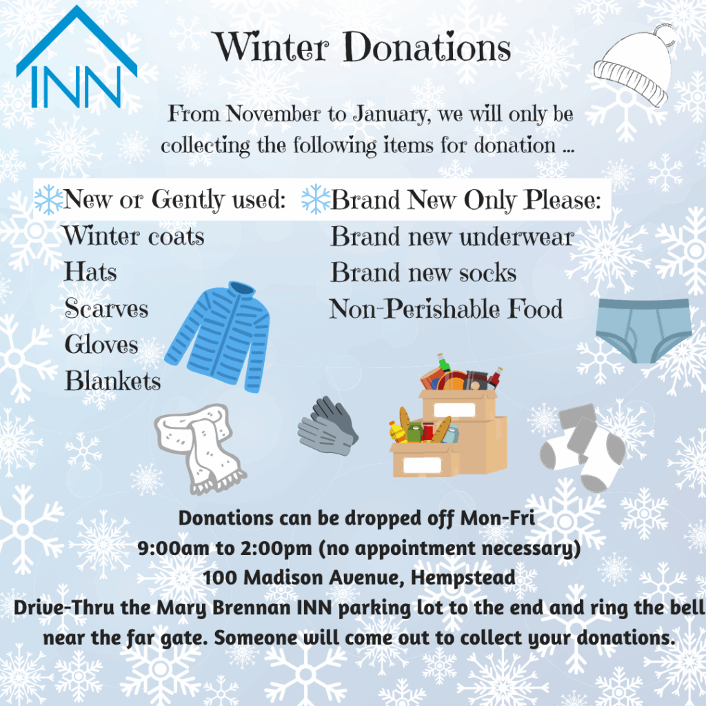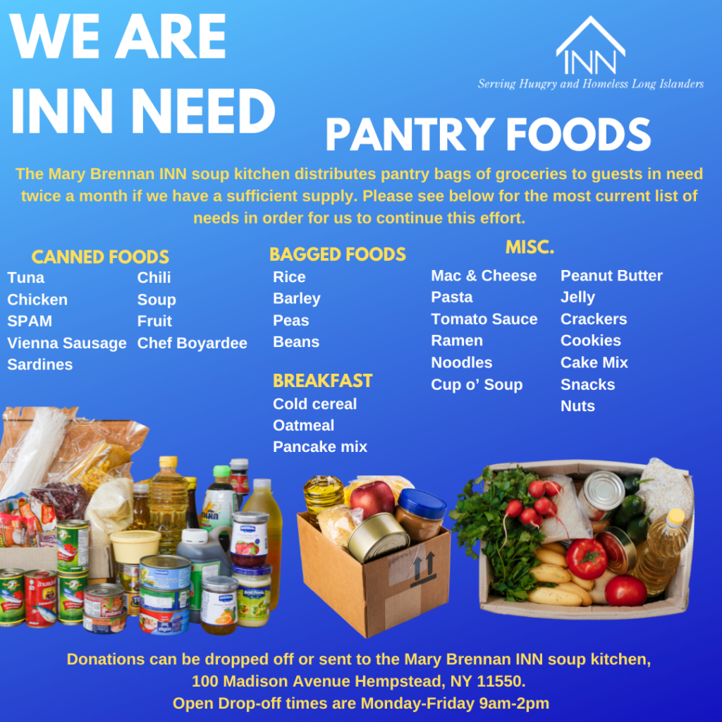 The INN operates the Mary Brennan INN soup kitchen, the largest soup kitchen on Long Island where over 200,000 meals are served annually. You can help us by hosting a food drive in your community of non-perishable, shelf-stable food items.