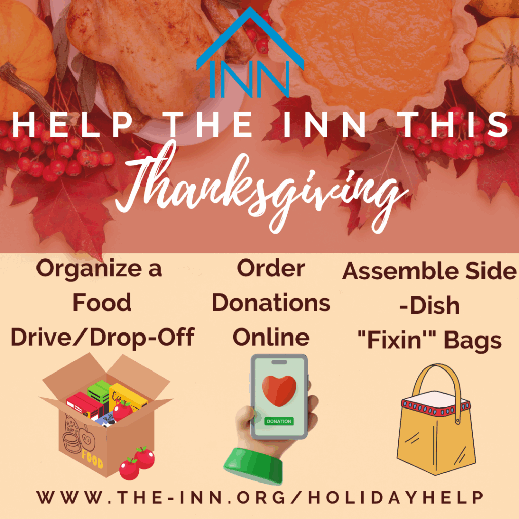 There are lots of ways you can help guests of The INN this Thanksgiving from wherever you are! Click on the links below for lists and instructions and #GetINNvolved with your family or group!